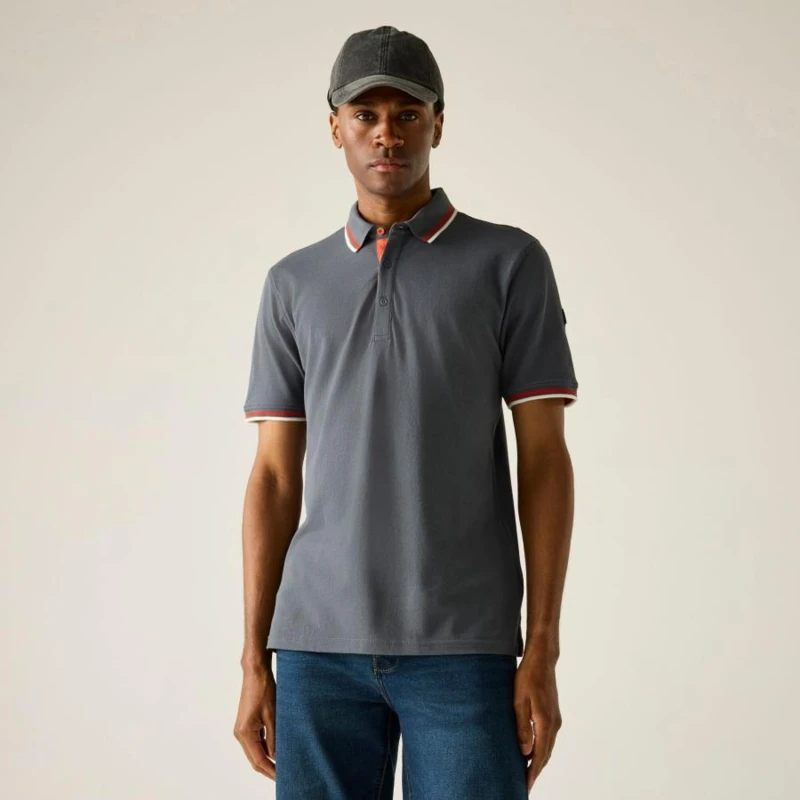 Férfi póló, Prémium férfi stretch piké póló 95% pamut, UV 40 védelem, sportos részletek, Ez a férfi rövid ujjú piké póló 95% pamut / 5% elasztán összetételû, 160 g/m? súlyú anyagból készült. A rugalmas pamut piké szövet kényelmes viseletet és jó szellőzést biztosít mindennapi használat során. A sportos kialakítást bordázott gallér és mandzsetta, kontrasztos csíkozott szegély, valamint előrehelyezett vállvarrás egészíti ki a nagyobb komfort érdekében. Az UPF 40 UV-védelem segít mérsékelni a napsugárzás hatását., Főbb jellemzők:, 95% pamut / 5% elasztán piké anyag, 160 g/m?, Bordázott gallér és mandzsetta, Csíkozott szegélyrész a galléron és az ujjakon, Előrehelyezett vállvarrás a kényelmesebb illeszkedésért, 3 gombos nyakpánt, Oldalsó hasíték részlet, UPF 40 UV-védelem, Ajánlott: Férfi galléros pólóként ideális mindennapi viselethez, utazáshoz, kiránduláshoz és könnyû szabadidős tevékenységekhez. Kiváló választás melegebb időben, amikor fontos a komfort és a sportosan elegáns megjelenés., Fenntarthatóság: A természetes pamut alapanyag kellemes viseletet és tartósságot biztosít. A minőségi anyaghasználat hosszabb élettartamot tesz lehetővé, csökkentve a gyakori cseréből eredő környezeti terhelést.