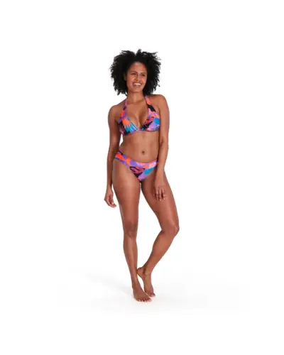 Nyári hangulat, egész évben, színes trópusi pálmafákkal rendelkezik. A klasszikus visszaköthető stílus háromszög bikinifelsővel kivehető melltartóbetéteket tartalmaz a kényelem és az alakformálás érdekében. Az ECO EnduraBrite anyagunk kiváló színteljesítményt kínál, így Ön hosszabb ideig élvezheti az élénk nyomatot. A hagyományos fürdőruha-szöveteknél nagyobb klórállóságot biztosító háromszög bikini hosszabb ideig illeszkedik a CREORA? HighClo?-hoz, és 100%-ban újrahasznosított anyagokból készült.