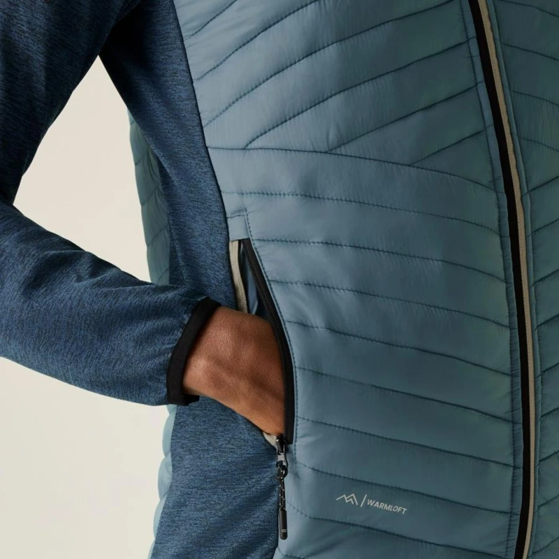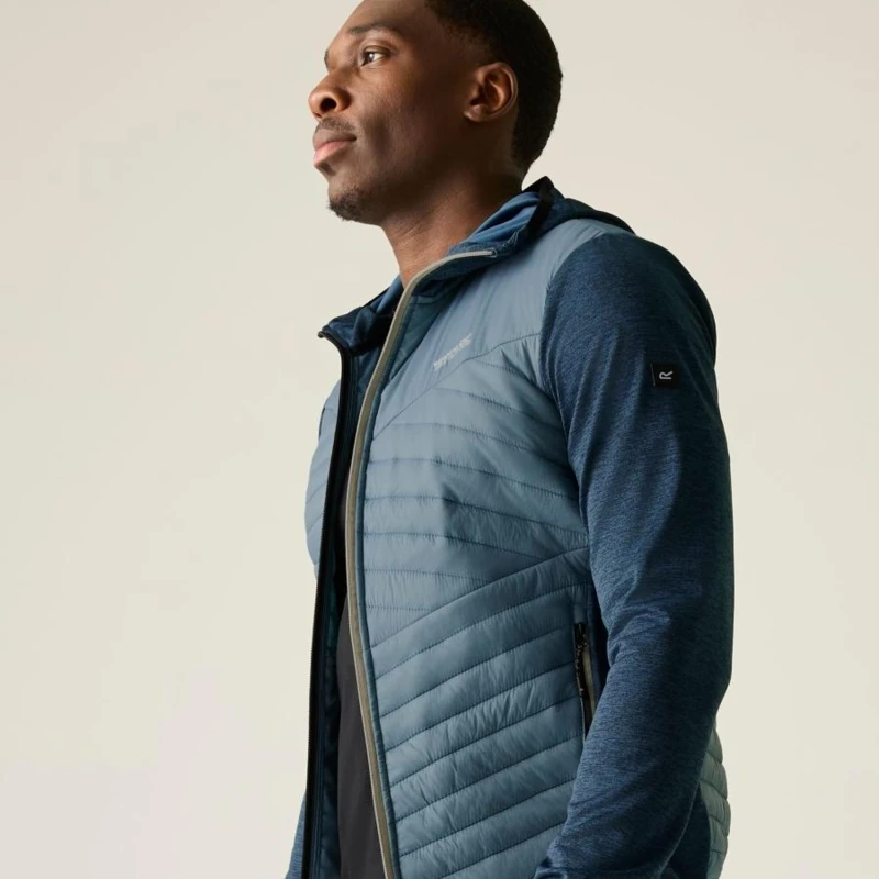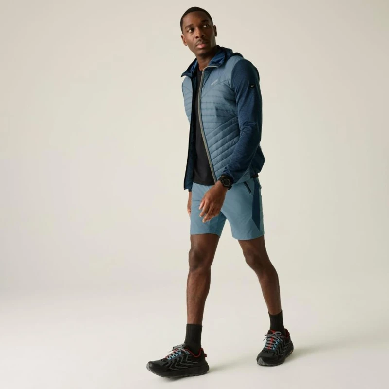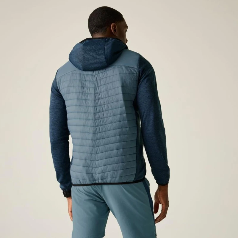 Férfi hibrid kabát, Prémium férfi könnyû hibrid szigetelt kabát Warmloft down-touch töltet, vízlepergető kivitel, stretch panelek, Ez a férfi technikai hibrid kabát 100% poliamid, ultrakönnyû 20D fő anyagból készült, mindössze 37 g/m? súlyban, amelyhez 100% poliészter melange stretch anyag hálós hátoldallal társul a fokozott komfort és mozgásszabadság érdekében. A test részen tartós vízlepergető bevonat biztosít védelmet enyhe csapadék ellen. Az újrahasznosított szintetikus Warmloft down-touch szigetelés 120 g/m? töltetsúllyal kiváló hőszigetelést nyújt pehelyhatású komforttal, miközben megőrzi könnyû súlyát és jó csomagolhatóságát., Főbb jellemzők:, 100% poliamid ultrakönnyû 20D külső anyag, 37 g/m?, 100% poliészter melange stretch anyag hálós hátoldallal, 160 g/m?, Tartós vízlepergető bevonat a törzsrészen, Újrahasznosított Warmloft down-touch szintetikus szigetelés, Szigetelés súlya: 120 g/m?, 2 alsó cipzáras zseb, Rugalmas szegély a kapucni peremén, a mandzsettán és az alsó részen, Ajánlott: Férfi könnyû hibrid szigetelt kabátként ideális túrázáshoz, trekkinghez, kiránduláshoz, utazáshoz és aktív szabadtéri programokhoz. Kiváló középréteg hidegebb időben, illetve önálló rétegként átmeneti időszakban., Fenntarthatóság: Az újrahasznosított Warmloft szigetelés csökkenti a környezeti terhelést, miközben magas hőkomfortot biztosít. A könnyû, tartós anyaghasználat hosszú élettartamot garantál, minimalizálva a gyakori cseréből eredő környezeti hatásokat.