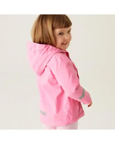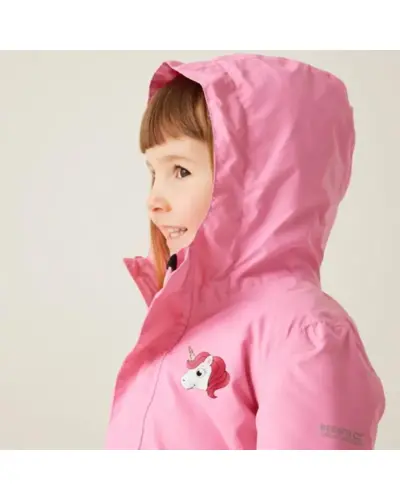 Gyerek bélelt esőkabát, Anyag: Isotex 10000 újrahasznosított 100% poliészter szövet, amely vízálló és lélegző., Lélegzőképesség: 10,000g/m?/24 óra értékelés, amely biztosítja a megfelelő szellőzést és nedvességelvezetést., Varratok: Ragasztott varratok, amelyek teljes vízállóságot biztosítanak., Vízlepergető bevonat: Tartós vízlepergető felülettel ellátott, amely megóvja a kabátot a nedvességtől., Szigetelés: Könnyû Thermoguard szigetelés, amely melegséget biztosít hûvös időben., Bélés: 100% poliészter taft bélés, amely kényelmes viseletet nyújt., Kapucni: Beépített kapucni silddel, amely extra védelmet nyújt az eső ellen., Dizájn: Állatos karakter nyomtatás a mellrészen, ami vidám és játékos megjelenést biztosít., Cipzár és viharvédő szegély: Elöl középen cipzárral és viharvédő szegéllyel a hideg szél és az eső elleni extra védelem érdekében., Zsebek: Két alsó zseb hajtókával és tépőzáras rögzítéssel a biztonságos tárolásért., Biztonsági elemek: 360 fokos fényvisszaverő szegélyek, amelyek növelik a láthatóságot és a biztonságot rossz látási viszonyok között., Ez a kabát ideális választás gyerekeknek, mivel nemcsak védelmet nyújt a hideg és nedves időjárás ellen, hanem vidám és vonzó megjelenést is biztosít az állatos nyomtatással. A teljes vízállóság, a könnyû szigetelés és a fényvisszaverő elemek további előnyöket nyújtanak, miközben a környezetbarát anyagok használata támogatja a fenntarthatóságot.