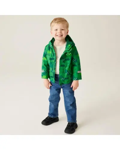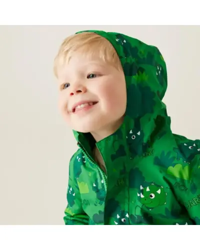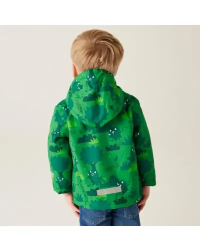 Gyerek bélelt esőkabát, Anyag: Isotex 10000 újrahasznosított 100% poliészter szövet, amely vízálló és lélegző., Lélegzőképesség: 10,000g/m?/24 óra értékelés, amely biztosítja a megfelelő szellőzést és nedvességelvezetést., Varratok: Ragasztott varratok, amelyek teljes vízállóságot biztosítanak., Vízlepergető bevonat: Tartós vízlepergető felülettel ellátott, amely megóvja a kabátot a nedvességtől., Szigetelés: Könnyû Thermoguard szigetelés, amely melegséget biztosít hûvös időben., Bélés: 100% poliészter taft bélés, amely kényelmes viseletet nyújt., Kapucni: Beépített kapucni silddel, amely extra védelmet nyújt az eső ellen., Dizájn: Állatos karakter nyomtatás a mellrészen, ami vidám és játékos megjelenést biztosít., Cipzár és viharvédő szegély: Elöl középen cipzárral és viharvédő szegéllyel a hideg szél és az eső elleni extra védelem érdekében., Zsebek: Két alsó zseb hajtókával és tépőzáras rögzítéssel a biztonságos tárolásért., Biztonsági elemek: 360 fokos fényvisszaverő szegélyek, amelyek növelik a láthatóságot és a biztonságot rossz látási viszonyok között., Ez a kabát ideális választás gyerekeknek, mivel nemcsak védelmet nyújt a hideg és nedves időjárás ellen, hanem vidám és vonzó megjelenést is biztosít az állatos nyomtatással. A teljes vízállóság, a könnyû szigetelés és a fényvisszaverő elemek további előnyöket nyújtanak, miközben a környezetbarát anyagok használata támogatja a fenntarthatóságot.