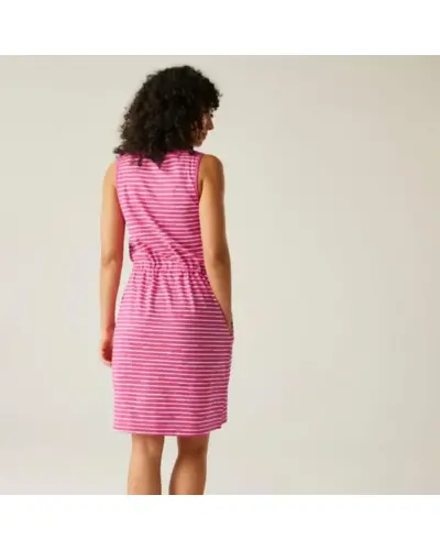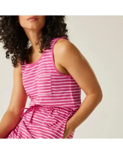 Női pamut ruha, 155gsm, 60% BCI pamut / 40% poliészter single jersey, Környakú (crew neck) kialakítás, 1 mellzseb, Rugalmas és állítható derékrész, 2 alsó zseb, UV védelem (UPF), Ideális választás mindennapi viselethez, sportos megjelenéshez és a káros napsugarak elleni védelemhez.