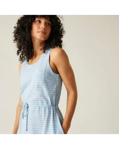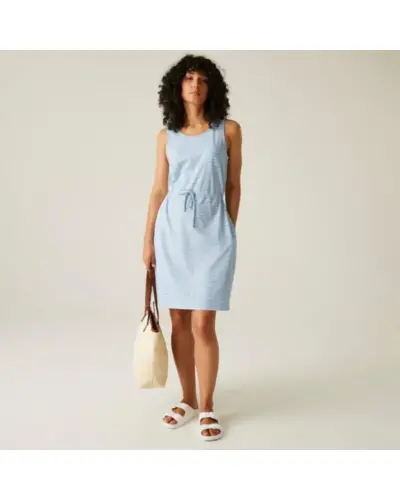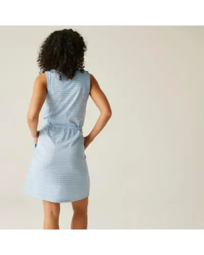 Női pamut ruha, 155gsm, 60% BCI pamut / 40% poliészter single jersey, Környakú (crew neck) kialakítás, 1 mellzseb, Rugalmas és állítható derékrész, 2 alsó zseb, UV védelem (UPF), Ideális választás mindennapi viselethez, sportos megjelenéshez és a káros napsugarak elleni védelemhez.