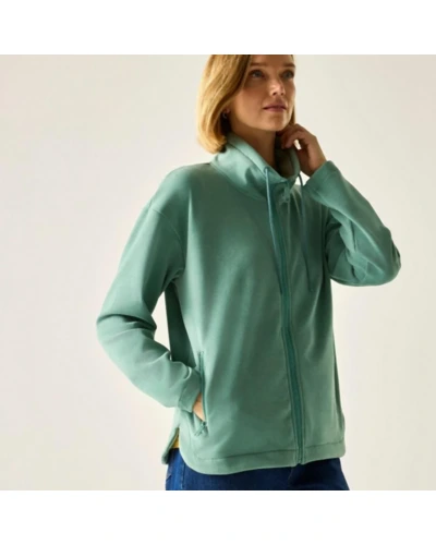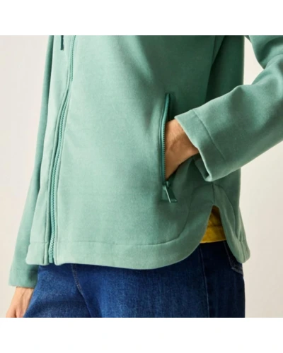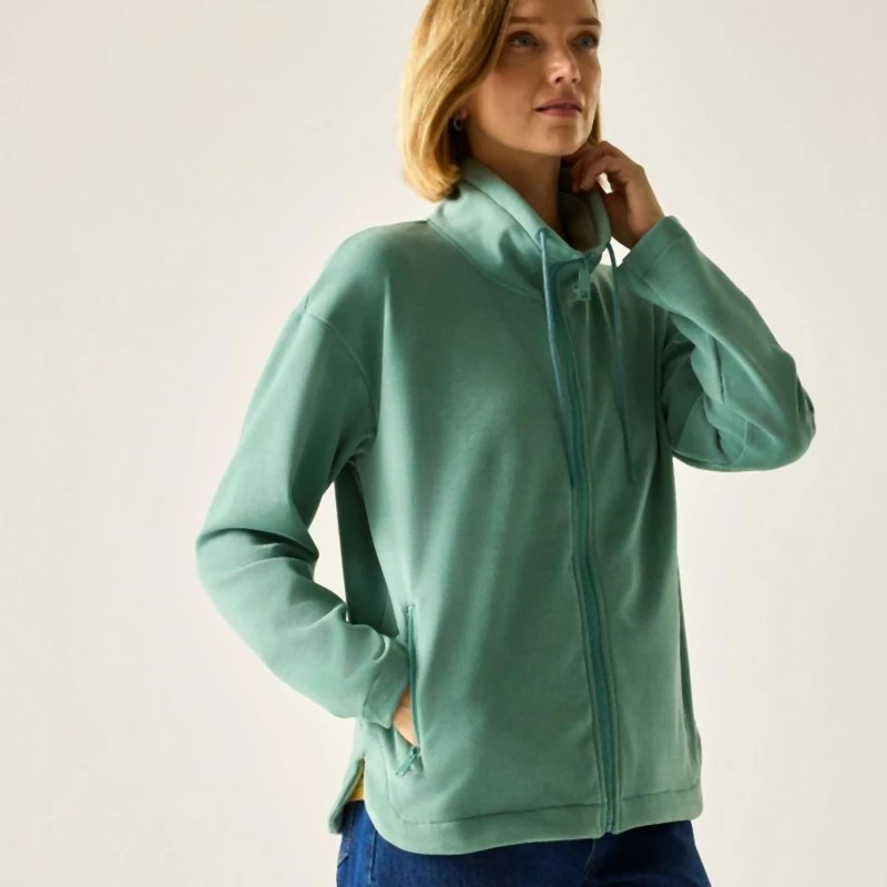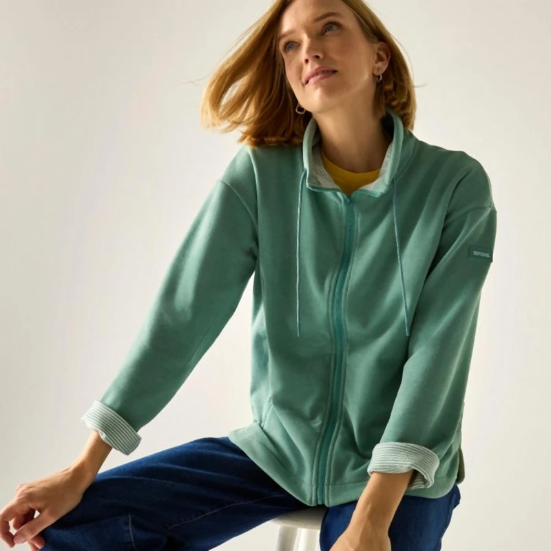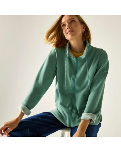 Női pamut pulóver, 60% viszkóz/40% pamut kötött anyag, kapucnis, Saját kötésû húzózsinórok, Kötött borda a szegélyeken és madzsettán
