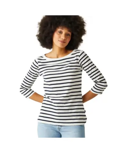 Női pamut felső, 155 g/m2 50% pamut/50% poliészter anyag, Széles csónak nyak, 3/4-es ujjú, 30-as UV-védelem (UPF).