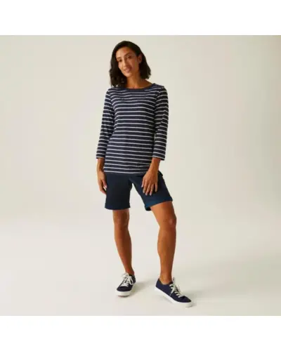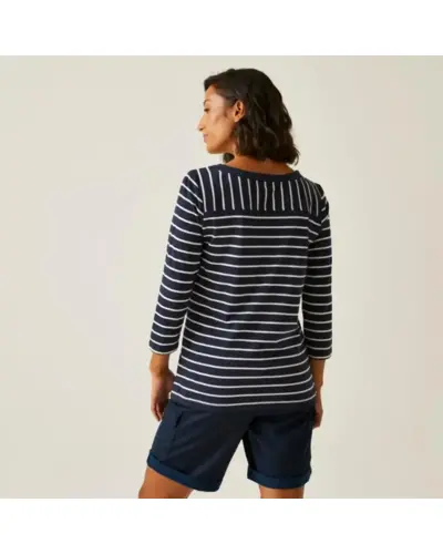 Női pamut póló, Anyag:, 155gsm, 60% BCI pamut / 40% poliészter single jersey szövet, Tulajdonságok:, Széles, hajónyakú kialakítás – elegáns megjelenést biztosít, 3/4 ujj – modern és kényelmes viselet, Oldalsó osztott alsó él – fokozott mozgásszabadság és stílusos részlet, UV-védelem (UPF 30+) – extra védelem a káros napsugarak ellen, Ideális választás mindennapi viselethez, ahol a stílus, a kényelem és a védelem egyaránt fontos.