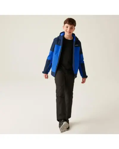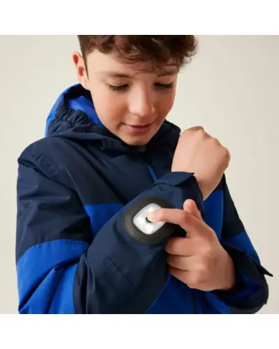 Gyerek bélelt 10000 vízálló és szélálló kabát, Anyag: Isotex 10000 újrahasznosított 100% poliészter szövet., Lélegzőképesség: 10,000g/m?/24 óra, ami jó szellőzést és nedvességkezelést biztosít., Vízlepergetés: Tartós vízlepergető bevonat., Varratok: Ragasztott varratok a teljes vízállóság érdekében., Szigetelés: Közepes vastagságú Thermoguard szigetelés., Kapucni: Beépített kapucni elasztikus szegéllyel., Cipzárvédő: A kényelem érdekében cipzárvédővel., Zsebek: Két cipzáras alsó zseb., Mandzsetták: Állítható mandzsetták., Különleges jellemzők: Brite Light ujj zseblámpa technológia három fényerősségi fokozattal, beépített újratölthető akkumulátorral., Állítható szegély: Állítható rugalmas szegély 7 éves kortól., Biztonság: 360 fokos fényvisszaverő csíkok a jobb láthatóság érdekében., Nyomtatott névcímke: 8 éves korig., Ez a kabát ideális választás azok számára, akik meleg, vízálló és jól szellőző felsőruházatot keresnek, amely környezetbarát és biztonsági funkciókkal is rendelkezik.