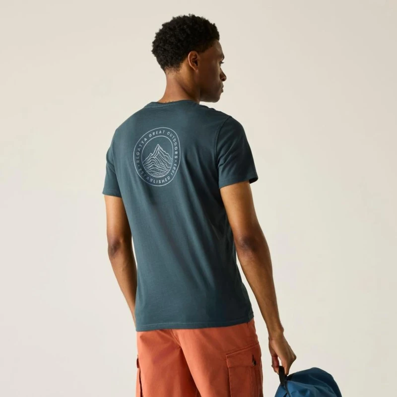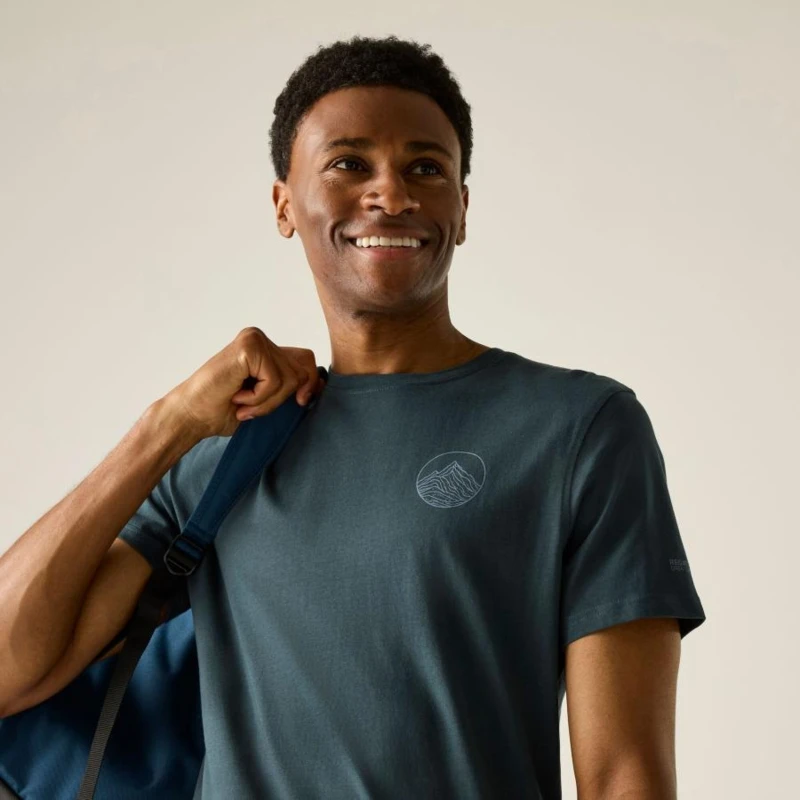 Férfi póló, 100% pamut póló – puha, UV-védett, grafikai mintával, Ez a 100% pamut single jersey anyagból készült póló (160 g/m?) rendkívül puha, kényelmes viseletet biztosít egész napra. A stílusos grafikai nyomat modern megjelenést ad, miközben a 50+ UPF UV-védelem védi a bőrt a nap káros sugarai ellen. Ideális könnyû, hétköznapi vagy szabadtéri használatra, ahol a kényelem és a védelem egyaránt fontos., 100% pamut single jersey – 160 g/m?, Extra puha, kellemes tapintás, Grafikai nyomat a stílusos megjelenésért, 50+ UPF UV-védelem, Ajánlott:, Szabadtéri tevékenységekhez, kiránduláshoz, városi viselethez, könnyû sportokhoz, nyári programokhoz, ahol fontos a kényelem és a nap elleni védelem.