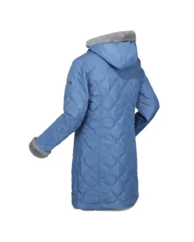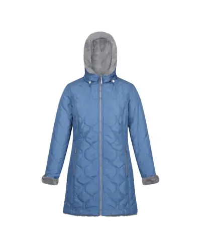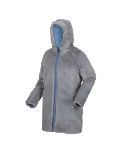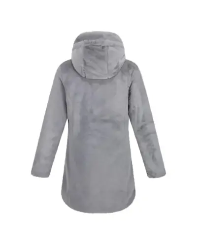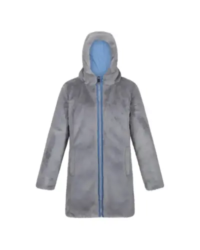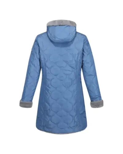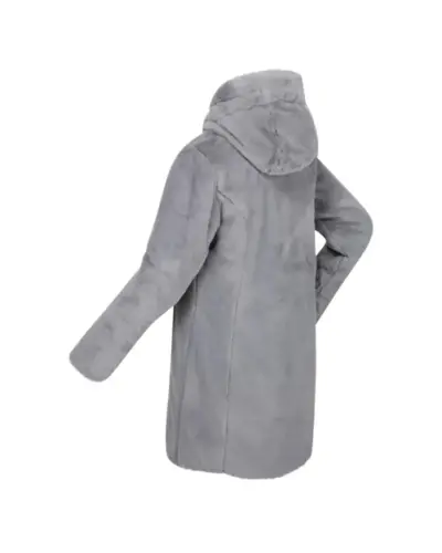 Női kifordítható télikabát, Egyik oldala 100% poliészter vízlepergető magas fényû steppelt anyag, Másik oldal 100% poliészter hosszú szálú mûszőrme, Szintetikus Warmloft tapintású szigetelő bélés, nem levehető állítható kapucni, egyik oldala steppelt, másik oldala mûszőrmés, 2 cipzáras alsó zseb az egyik oldalon és 2 alsó zseb a másik oldalon, Megfordítható