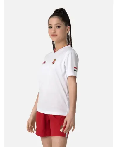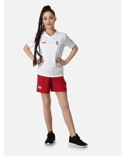 Stílusos és letisztult megjelenésû V-nyakú szurkolói mez a Dorko Hungary Kids palettáján 100% poliészter anyagból. Könnyen száradó, légáteresztő anyagának köszönhetően rendkívül kényelmes viseletet biztosít. Mellrészén elegáns címer és márkajelzés, ujján zászló, hátul diszkrét HUNGARY felirat kapott helyet.