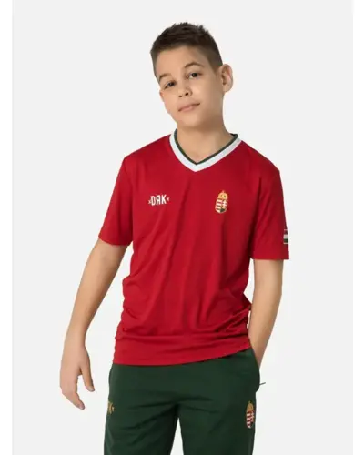 Stílusos és letisztult megjelenésû V-nyakú szurkolói mez a Dorko Hungary Kids palettáján 100% poliészter anyagból. Könnyen száradó, légáteresztő anyagának köszönhetően rendkívül kényelmes viseletet biztosít. Mellrészén elegáns címer és márkajelzés, ujján zászló, hátul diszkrét HUNGARY felirat kapott helyet.