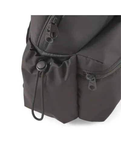 Two-way zip opening into main compartment, internal slip-in pocket, 150D PES lining with heat embossed PUMA wording, exposed front zip pocket, two side pockets with adjustable opening with a drawcord string and cord stopper, carrying webbing handle, adjustable webbing shoulder straps, white Cat Logo embroidery on front, branded metal hardware.