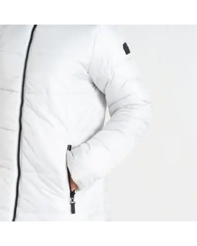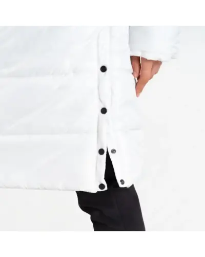 Női télikabát 10000 vízálló, Anyag: Újrahasznosított poliészter fényes szövet, Felületkezelés: Víztaszító, Környezetbarát: PFC, PFOA, PFOS mentes anyag, Töltet: Újrahasznosított, magas melegséget biztosító töltet (iLoft Ecofill), Design: Funkcionális divat, párnázott sziluett, Kapucni: Fix (grown on) kapucni, Cipzár:, Masszív matt fekete középső cipzár, Zsebek:, 2 kézmelegítő zseb masszív matt fekete cipzárral, Szellőzés: Patentos szellőzők az alsó szegély oldalain a szabad mozgás érdekében, Mandzsetta: Belső elasztikus mandzsetta a melegebb illeszkedésért, Bélés: Újrahasznosított poliészter bélés, Ez a kabát újrahasznosított poliészter fényes anyagból készült, amely modern és elegáns megjelenést biztosít. A víztaszító felületkezelés és a PFC, PFOA, PFOS mentes anyag környezetbarát és praktikus választás. Az iLoft Ecofill újrahasznosított töltet magas melegséget biztosít, míg a párnázott sziluett és a fix kapucni stílusos és kényelmes viseletet garantálnak. A masszív matt fekete középső cipzár és a kézmelegítő zsebek masszív matt fekete cipzárai praktikusak és esztétikusak. A patentos szellőzők az alsó szegély oldalain a szabad mozgást biztosítják, míg a belső elasztikus mandzsetta extra melegséget nyújt. Az újrahasznosított poliészter bélés tovább fokozza a kabát kényelmét és fenntarthatóságát. Ez a kabát ideális választás hideg és nedves időjárási körülmények között.