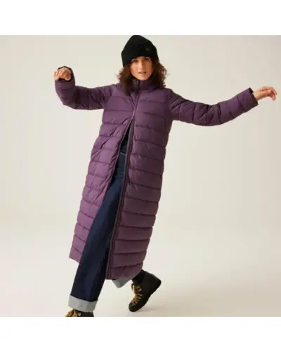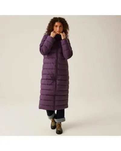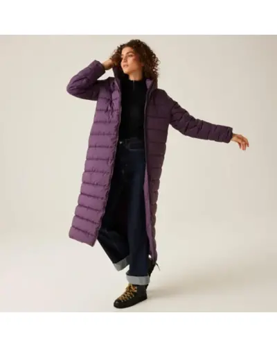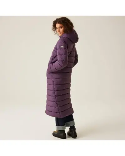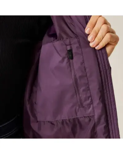 Női vastag steppelt kabát, Újrahasznosított 100% poliészter anyag, Tartós vízlepergető felület, Feather Free – prémium minőségû újrahasznosított szintetikus pehelyszigetelés, fix kapucni, Belső zseb, alsó zseb rejtett cipzárral, Belső Lycra mandzsetta