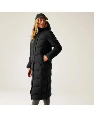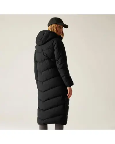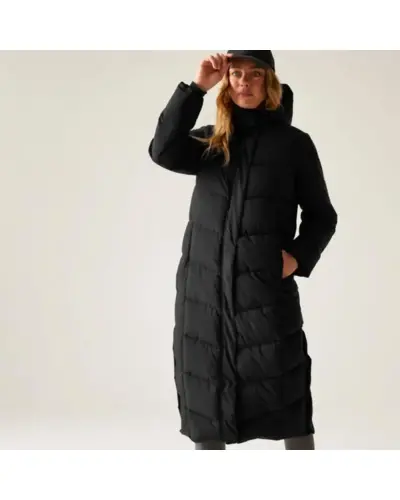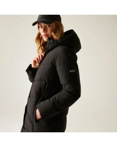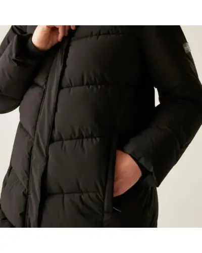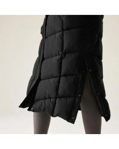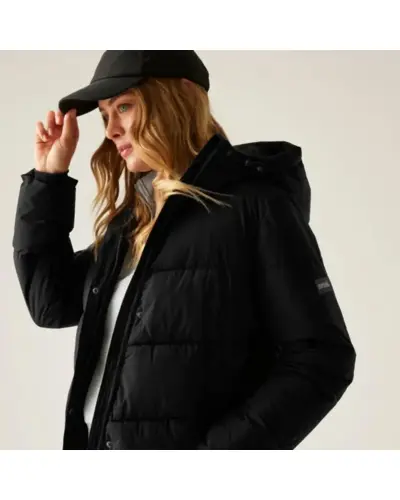 Női télikabát, Női télikabát – pehelymentes melegséggel és modern dizájnnal, Ez a könnyû, mégis rendkívül meleg női télikabát kiváló társ a hideg, nedves napokon. A vízlepergető, rugalmas poliészter anyag maximális kényelmet és mozgásszabadságot biztosít, míg a 280 g-os prémium újrahasznosított szintetikus töltet garantálja a pehelyhez hasonló melegséget – állati eredetû anyag nélkül., A rejtett cipzáras zsebek, a belső biztonsági zseb, valamint a szélálló belső mandzsetták extra funkcionalitást kínálnak. A kabát oldalán található patentos nyílások nemcsak stílusosak, de könnyû mozgást is biztosítanak. A taffeta bélés és az állítható kapucni tovább növeli a komfortot. Ráadásul a modell újrahasznosított anyagokból készült, így környezettudatos választás is egyben., 100% poliészter stretch anyag – 80 g/m?, 280 g-os újrahasznosított pehelymentes szintetikus szigetelés, Vízlepergető külső kezelés, 100% poliészter taffeta bélés, Fix kapucni állítható zsinórral, 2 alsó zseb rejtett cipzárral, Belső cipzáras biztonsági zseb, Belső viharhajtók a mandzsettáknál, Oldalsó, márkázott funkcionális patentok, Környezetbarát kialakítás – újrahasznosított alapanyagokból, Meleg, praktikus és divatos – ideális választás télre, Fenntartható megoldás a hideg napokra