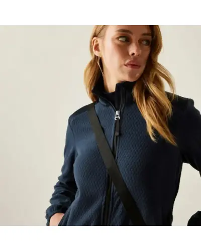 Női polár felső, Női méhsejt mintás technikai fleece sportos megjelenés, megbízható komfort, Ez a két tónusú, méhsejt textúrájú fleece felső modern stílust és funkcionális kényelmet kínál, legyen szó kirándulásról, városi sétáról vagy aktív hétköznapokról. A raglánujjak szabad mozgást biztosítanak, míg a praktikus ujj- és oldalzsebek extra helyet kínálnak a szükséges apróságoknak., Anyag: 100% poliészter, két tónusú méhsejt fleece 230 g/m?, Raglánujjas kialakítás a kényelmes mozgásért, 1 cipzáras ujjzseb és 2 cipzáras alsó zseb, Újrahasznosított anyagból készült fenntartható választás, Ajánlott: aktív szabadtéri tevékenységekhez, középrétegként kabát alá, vagy sportos hétköznapi viselethez, Kényelmes, praktikus, környezettudatos ideális választás mozgásban lévőknek.