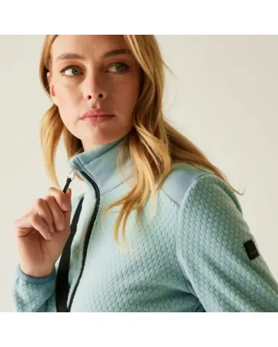 Női polár felső, Női méhsejt mintás technikai fleece sportos megjelenés, megbízható komfort, Ez a két tónusú, méhsejt textúrájú fleece felső modern stílust és funkcionális kényelmet kínál, legyen szó kirándulásról, városi sétáról vagy aktív hétköznapokról. A raglánujjak szabad mozgást biztosítanak, míg a praktikus ujj- és oldalzsebek extra helyet kínálnak a szükséges apróságoknak., Anyag: 100% poliészter, két tónusú méhsejt fleece 230 g/m?, Raglánujjas kialakítás a kényelmes mozgásért, 1 cipzáras ujjzseb és 2 cipzáras alsó zseb, Újrahasznosított anyagból készült fenntartható választás, Ajánlott: aktív szabadtéri tevékenységekhez, középrétegként kabát alá, vagy sportos hétköznapi viselethez, Kényelmes, praktikus, környezettudatos ideális választás mozgásban lévőknek.
