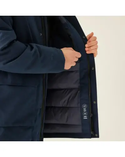 Férfi vastagabb bélelt vízálló kabát 10.000 mmm, Ez a vízálló és lélegző újrahasznosított Isotex 10000 anyagból készült kabát ideális választás , hideg és nedves időjárási körülményekhez., Anyag: Vízálló és lélegző Isotex 10000 100% poliészter, gyapjú hatású anyagból márvány mintás, Lélegzőképesség: 10,000g/m?/24 óra , Vízállóság: Tartós víztaszító bevonat., Varrott varrások: Teljes vízállóságot biztosítanak., Szigetelés: Közepes súlyú Feather Free prémium újrahasznosított szintetikus pehelyszigetelés., Bélés: Poliamid bélés és béléspanelek a hőszigetelés érdekében., Belső cipzáras biztonsági zseb, 2 alsó nagy zseb oldalsó kézmelegítő zsebekkel, Kapucni: Integrált kapucni rejtett állítókkal., Mandzsetták: Állítható mandzsetták., Ez a kabát ideális választás bárki számára, aki meleg, kényelmes és környezetbarát megoldást , keres a hideg és esős időjárásban történő szabadtéri tevékenységekhez.