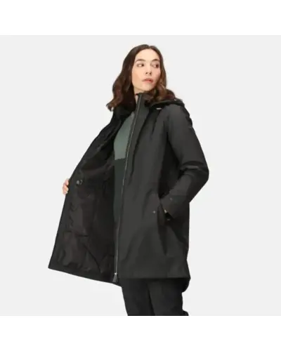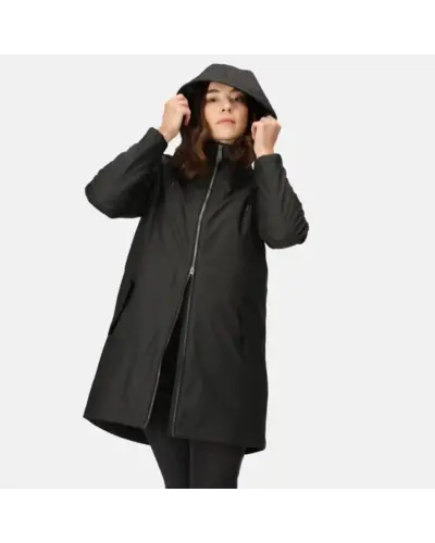 Női bélelt kabát, 100% poliészter PU anyag, Tartós vízlepergető felület, 100%-ban újrahasznosított Thermoguard szigetelő töltet, 100% poliészter taft bélés, fix kapucni, mûszőrme hátmelegítő, 2 alsó zseb , Állítható húzózsinóros derékrész, Állítható mandzsetta