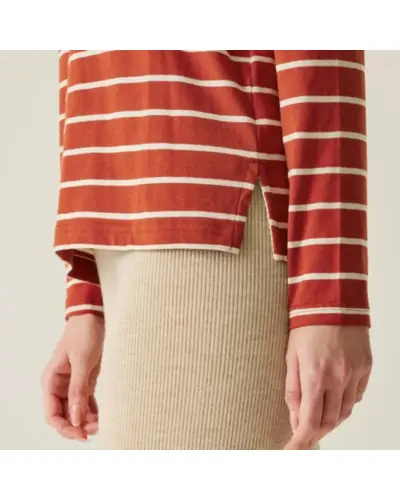 Női pamut póló, 155 gsm sûrûségû, 60% fenntartható pamut és 40% poliészter anyagból készült, csíkozott, szálfestett szövet, Kerek nyakkivágás, Oldalsó hasítékok az alsó szegélynél, Ez a könnyû és kényelmes felső fenntartható pamut és poliészter keverékéből készült, így egyszerre kínálja a természetes pamut puhaságát és a poliészter tartósságát. A szálfestett csíkozott minta modern és divatos megjelenést biztosít. A kerek nyakkivágás klasszikus és időtálló stílust nyújt, míg az oldalsó hasítékok az alsó szegélynél növelik a mozgás szabadságát és a kényelem érzetét. Ez a ruhadarab ideális választás mindennapi viseletre, legyen szó hétköznapi vagy lazább alkalmi öltözékről.