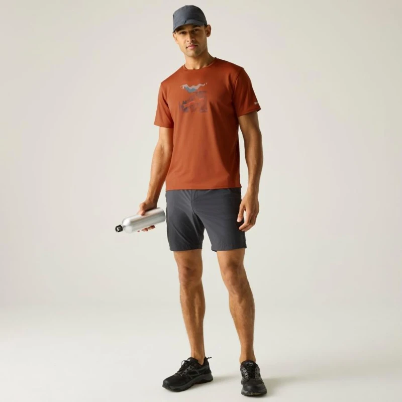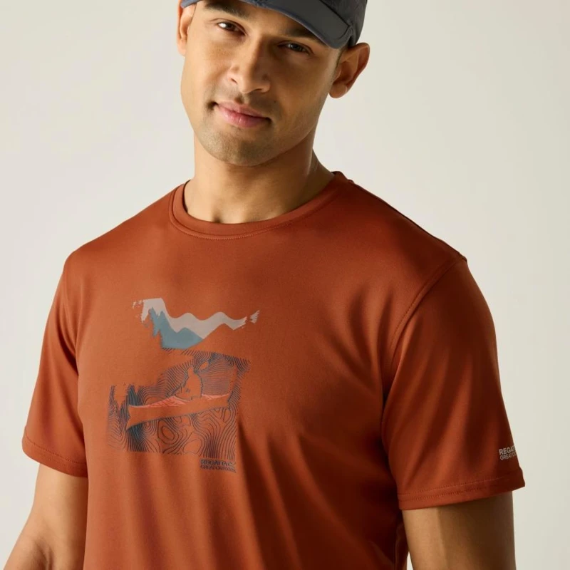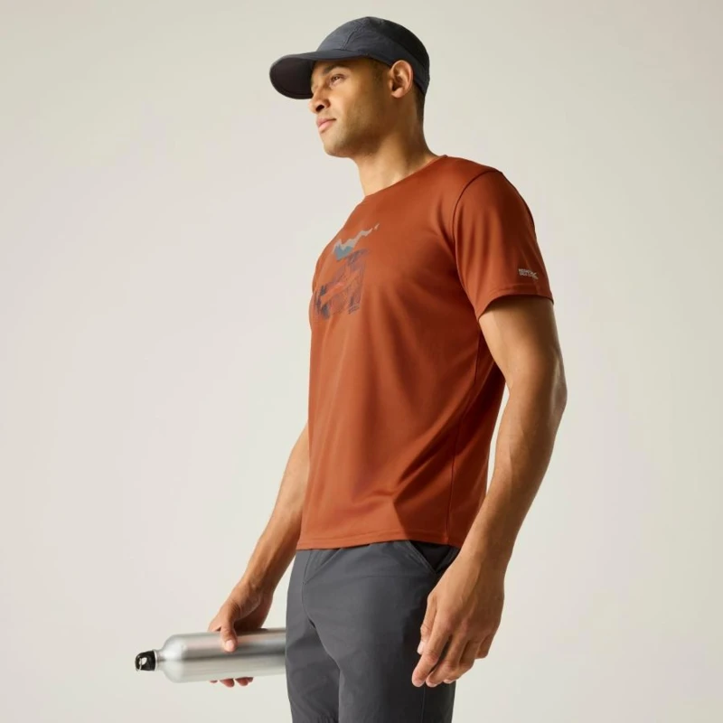 Férfi póló, Technikai póló 100% poliészterből – gyorsan száradó, grafikai mintával, Ez a könnyû, 100% poliészter piqué anyagból készült technikai póló (135 g/m?) rugalmas és jól szellőző, ideális aktív használatra. A 100% poliészter gyorsan száradó marl jersey betétek (100 g/m?) tovább fokozzák a légáteresztést és a komfortérzetet. A technikai szövet hatékony nedvességelvezető képességgel és gyors száradási tulajdonsággal rendelkezik. A pólót stílusos grafikai nyomat egészíti ki, így sportos és modern megjelenést biztosít., 100% poliészter piqué anyag – 135 g/m?, 100% gyorsan száradó poliészter marl jersey betétek – 100 g/m?, Jó nedvességelvezető teljesítmény, Gyorsan száradó technikai szövet, Légáteresztő, kényelmes viselet, Ajánlott:, Futáshoz, túrázáshoz, edzéshez, kerékpározáshoz, kempingezéshez és minden olyan szabadtéri tevékenységhez, ahol fontos a könnyû, gyorsan száradó, légáteresztő technikai póló.