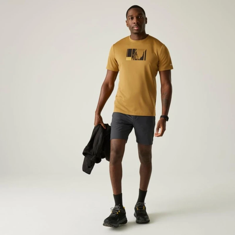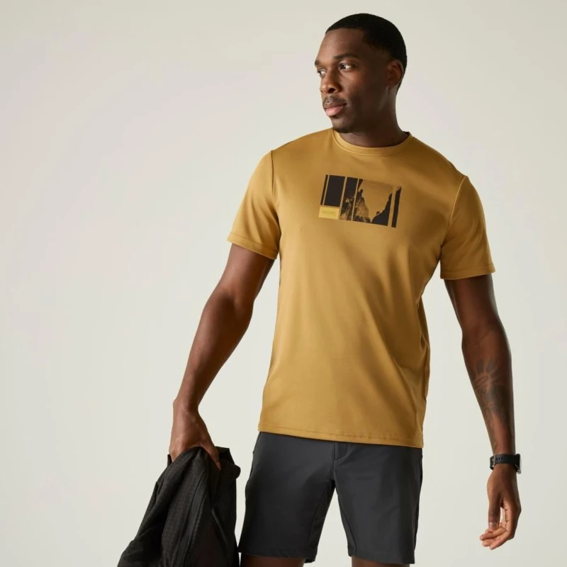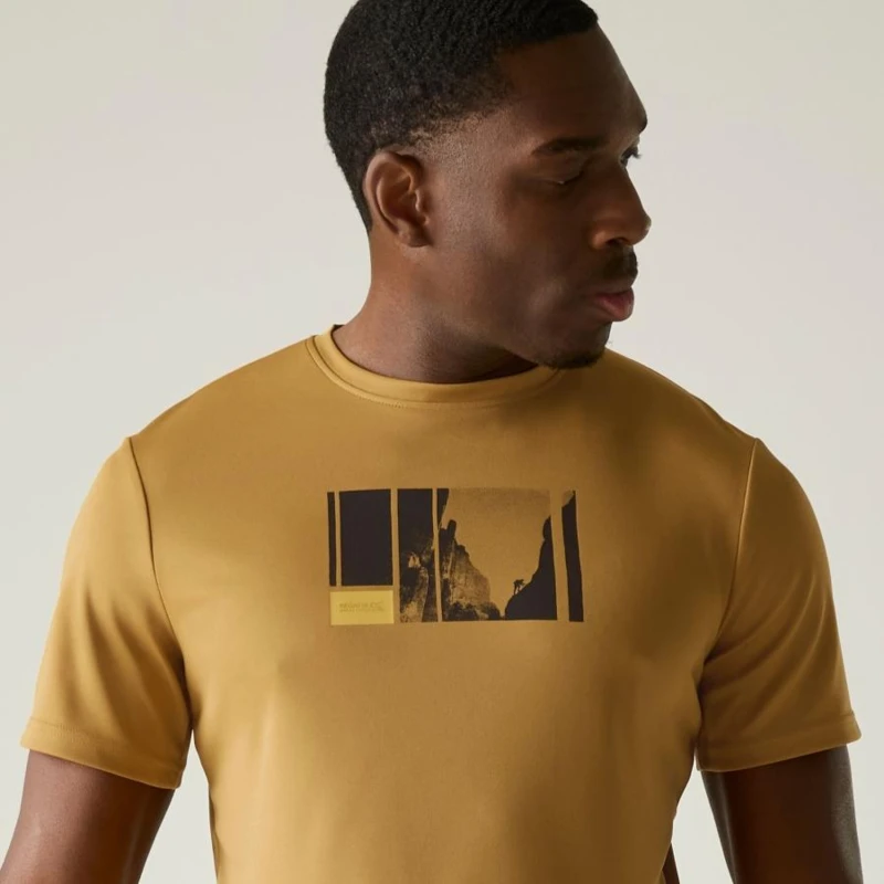 Férfi póló, Technikai póló 100% poliészterből – gyorsan száradó, grafikai mintával, Ez a könnyû, 100% poliészter piqué anyagból készült technikai póló (135 g/m?) rugalmas és jól szellőző, ideális aktív használatra. A 100% poliészter gyorsan száradó marl jersey betétek (100 g/m?) tovább fokozzák a légáteresztést és a komfortérzetet. A technikai szövet hatékony nedvességelvezető képességgel és gyors száradási tulajdonsággal rendelkezik. A pólót stílusos grafikai nyomat egészíti ki, így sportos és modern megjelenést biztosít., 100% poliészter piqué anyag – 135 g/m?, 100% gyorsan száradó poliészter marl jersey betétek – 100 g/m?, Jó nedvességelvezető teljesítmény, Gyorsan száradó technikai szövet, Légáteresztő, kényelmes viselet, Ajánlott:, Futáshoz, túrázáshoz, edzéshez, kerékpározáshoz, kempingezéshez és minden olyan szabadtéri tevékenységhez, ahol fontos a könnyû, gyorsan száradó, légáteresztő technikai póló.