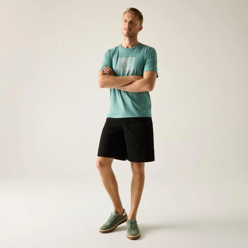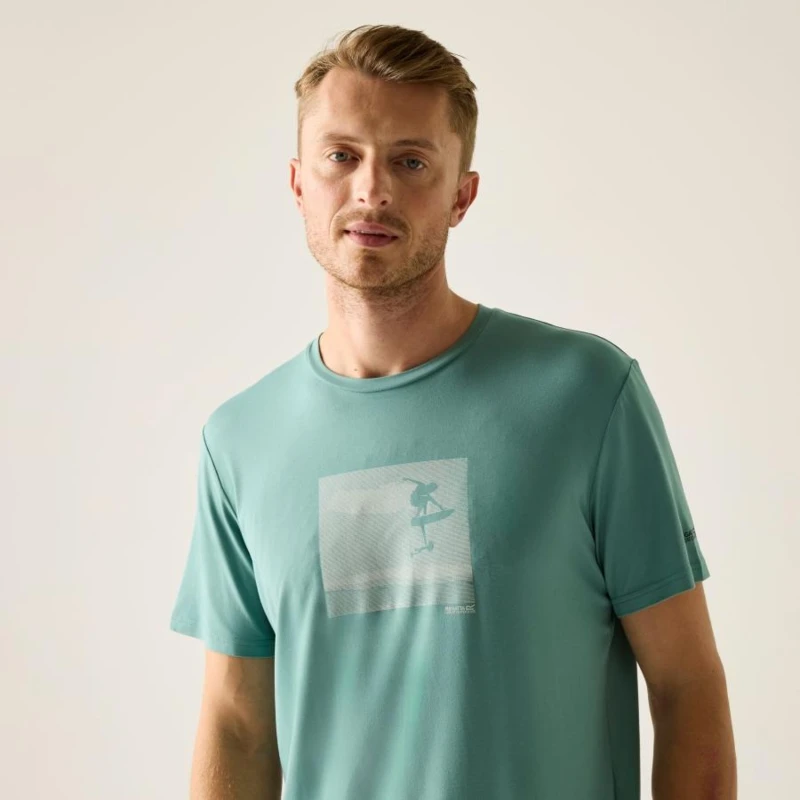 Férfi póló, Soft-touch technikai póló – rugalmas, gyorsan száradó, UV-védett kivitel, Ez a 92% poliészter és 8% elasztán összetételû soft-touch stretch jersey anyagból készült póló (160 g/m?) puha, kényelmes viseletet biztosít, miközben aktív mozgás közben is megtartja a formáját. A technikai szövet hatékony nedvességelvezető képességgel és gyors száradási tulajdonsággal rendelkezik, így ideális futáshoz, túrázáshoz vagy edzéshez. A grafikai nyomat stílusos megjelenést ad, a 50+ UPF UV-védelem pedig a nap káros sugarai ellen nyújt biztonságot., 92% poliészter / 8% elasztán soft-touch stretch jersey – 160 g/m?, Jó nedvességelvezető teljesítmény, Gyorsan száradó technikai szövet, Légáteresztő és kényelmes viselet, 50+ UPF UV-védelem, Ajánlott:, Futáshoz, túrázáshoz, kerékpározáshoz, edzéshez, szabadtéri sportokhoz és minden olyan aktív tevékenységhez, ahol fontos a könnyû, gyorsan száradó, rugalmas és UV-védett póló.