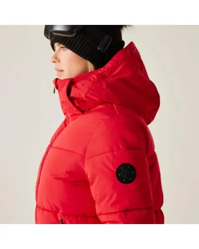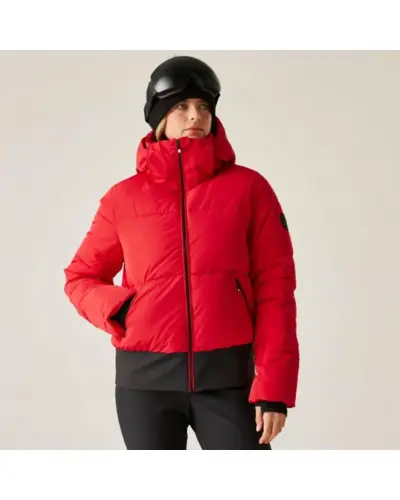 Női prémium síkabát 15.000, Prémium női softshell síkabát – vízálló, légáteresztő, újrahasznosított anyagból, Swarovski kristályos díszítéssel, Ez az exkluzív női síkabát Ared 15/15 membránnal készült, amely 15 000 mm vízállóságot és 15 000 g/m?/24h légáteresztést biztosít, így megbízható védelmet nyújt a hó, szél és hideg ellen. A Swarovski kristályos díszítés elegáns, prémium megjelenést kölcsönöz, míg a teljes sífunkciós felszereltség – beleértve a síbérlet-zsebet, belső tárolózsebet és hővédő részleteket – a maximális kényelmet garantálja. Ideális választás síeléshez, snowboardozáshoz, téli túrákhoz és aktív szabadtéri programokhoz., Újrahasznosított, vízálló és légáteresztő anyag – Ared 15/15 (15 000 mm / 15 000 g/m?/24h), Swarovski kristályos díszítés a kapucninyílásnál, jelvényeken és cipzárhúzókon, Kritikus varrások vízálló ragasztása a fokozott védelemért, Tartós vízlepergető (DWR) felületkezelés, Levehető, állítható kapucni, Síbérlet-zseb az ujjon, Puha polár gallérbélés a nagyobb hőérzetért, Meleg belső ujjmandzsetták, Belső hálós tárolózseb szemüvegtörlő kendővel, Kopásálló, hosszú élettartamra tervezett anyag, PFC-, PFOA-, PFOS-mentes kivitel, Kényelmes, laza szabás, Ajánlott: női síkabát és női sídzseki síeléshez, snowboardozáshoz, téli sportokhoz, havas kirándulásokhoz és hideg időben történő városi viselethez.