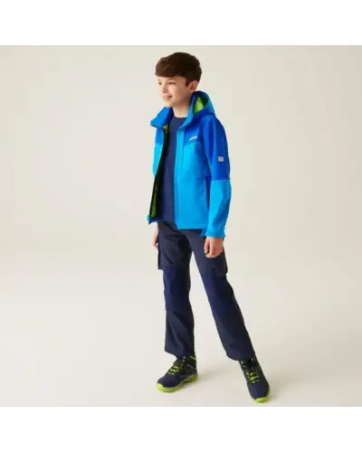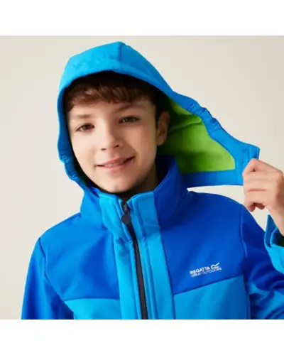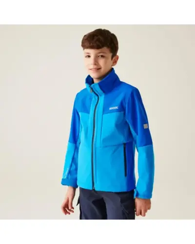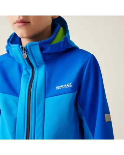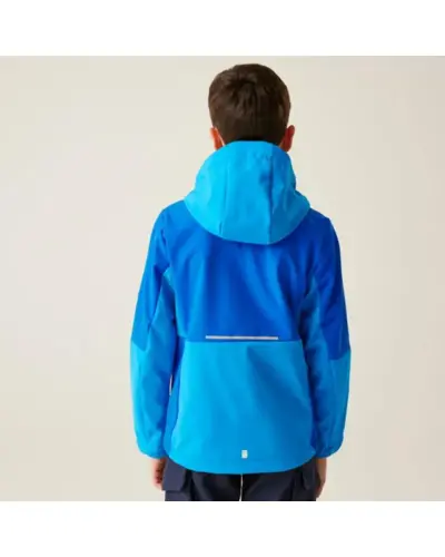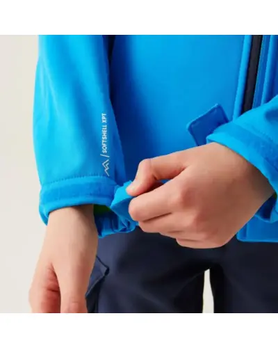 Gyerek softshell kabát, Anyag: Meleg hátoldalú, újrahasznosított Softshell XPT stretch szövet, amely rugalmasságot és kényelmet biztosít., Membrán: Víz- és szélálló membrán anyag, amely megvédi viselőjét a kedvezőtlen időjárási körülményektől., Vízlepergető felület: Tartós vízlepergető bevonattal ellátott, hogy megóvja a kabátot az esőtől és nedvességtől., Lélegzőképesség: 10,000g/m?/24 óra lélegzőképességi érték, amely biztosítja a jó szellőzést és nedvességkezelést., Kapucni: Levehető kapucni elasztikus szegéllyel a jobb illeszkedés és védelem érdekében., Cipzárvédő: Cipzárvédő, amely növeli a kényelmet viselés közben, és véd a szél behatolása ellen., Zsebek: Két cipzáras alsó zseb a biztonságos tárolás érdekében., Állítható szegély: Állítható rugalmas szegély 7 éves kortól, amely lehetővé teszi a kabát szorosabb illeszkedését., Biztonsági elemek: 360 fokos fényvisszaverő csíkok, amelyek növelik a láthatóságot és biztonságot biztosítanak gyenge fényviszonyok között., Nyomtatott névcímke: Nyomtatott névcímke 8 éves korig, amely segíti a kabát azonosítását., Ez a kabát ideális választás változékony időjárási körülmények között, mivel víz- és szélálló, jól szellőzik, kényelmes, és extra biztonsági funkciókkal rendelkezik, miközben környezettudatos megoldásokat kínál.