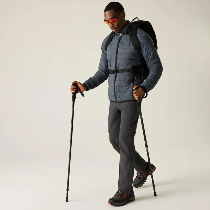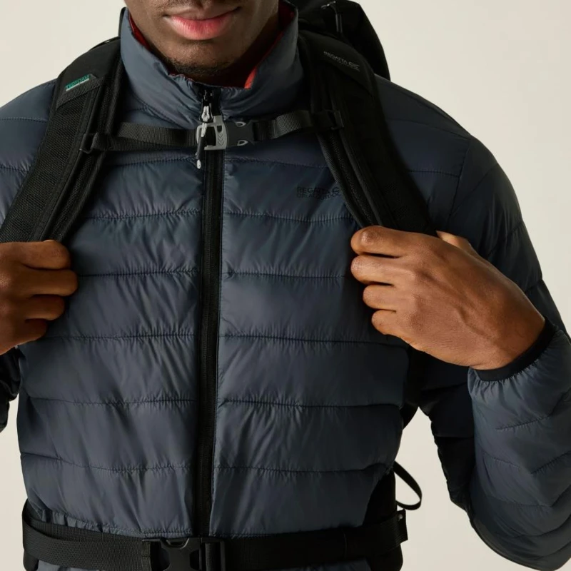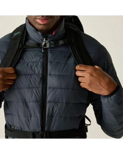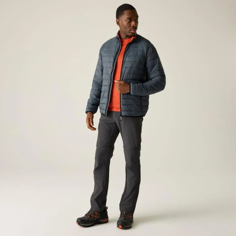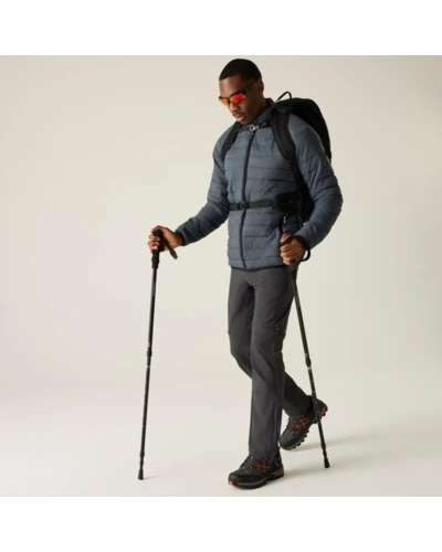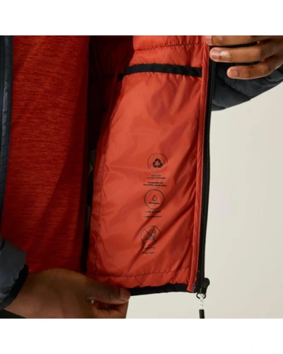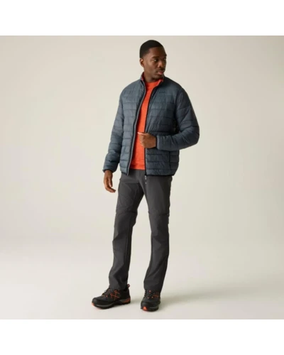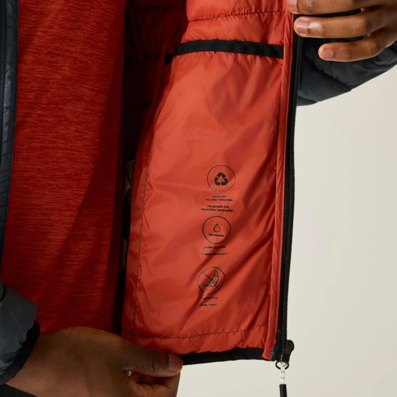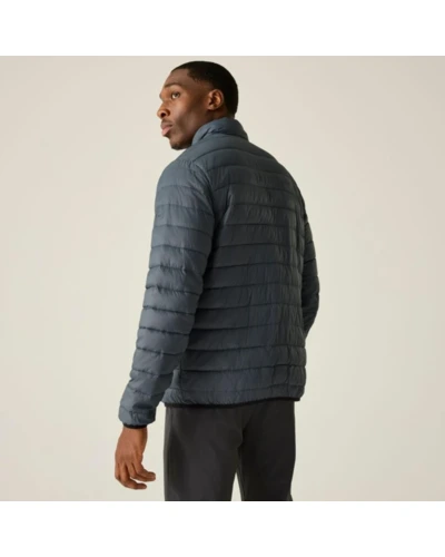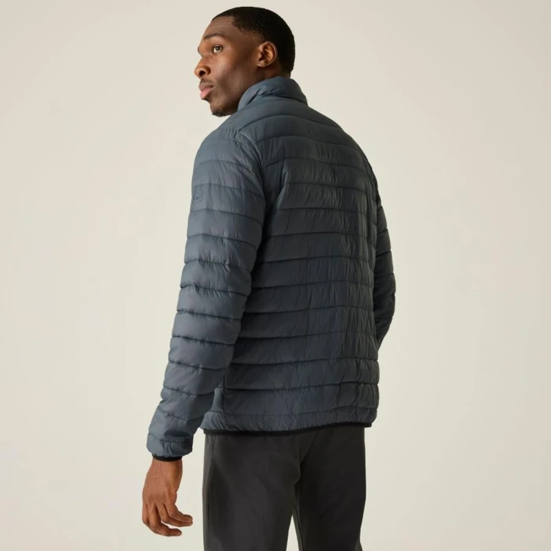 Férfi steppelt kabát, Könnyû 20d poliamid anyag, Tartós vízlepergető felület, Feather Free prémium minőségû újrahasznosított szintetikus pehely szigetelés, Könnyû töltet, Könnyen összenyomható, 2 cipzáras alsó zseb, rugalmas szegélyek, saját zsákba csomagolható