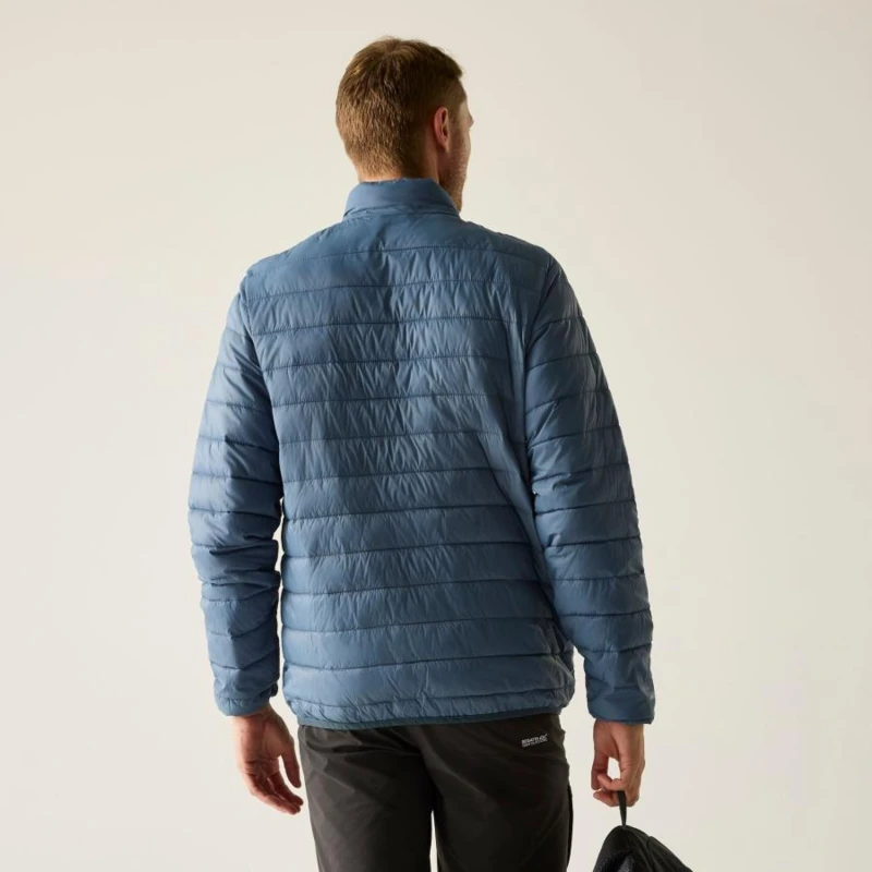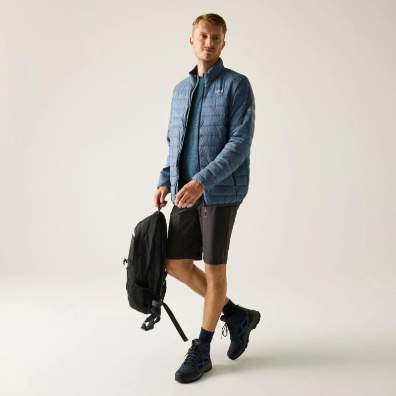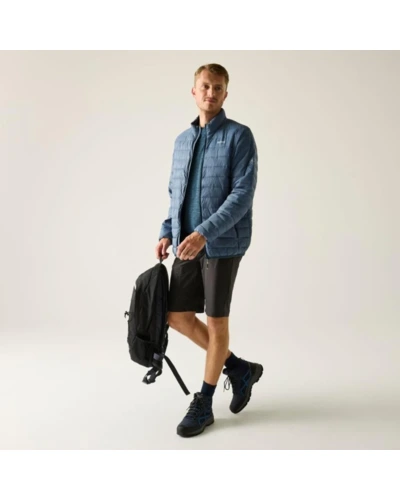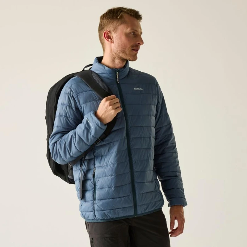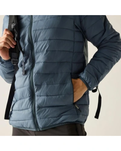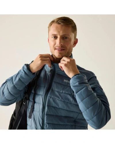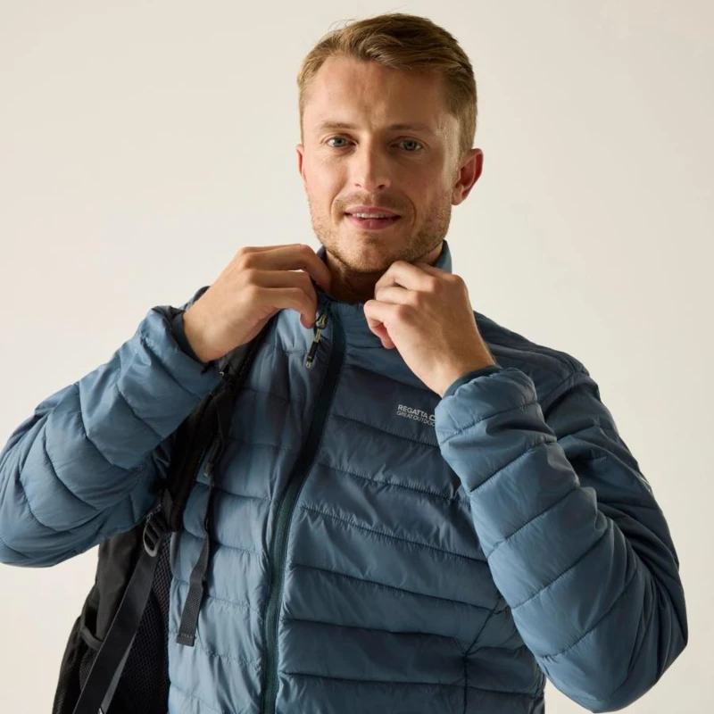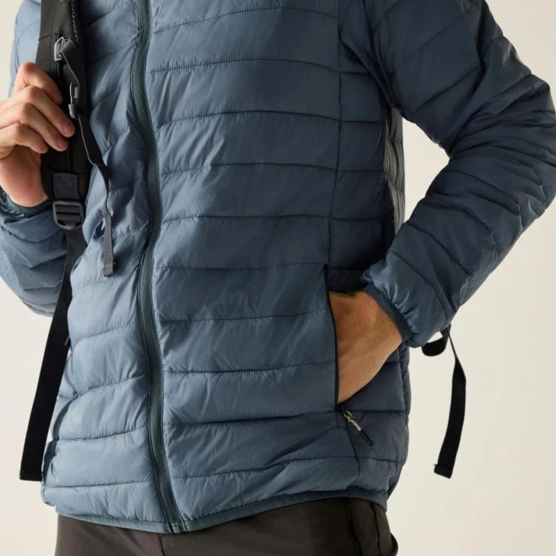 Férfi steppelt kabát, Könnyû 20d poliamid anyag, Tartós vízlepergető felület, Feather Free prémium minőségû újrahasznosított szintetikus pehely szigetelés, Könnyû töltet, Könnyen összenyomható, 2 cipzáras alsó zseb, rugalmas szegélyek, saját zsákba csomagolható