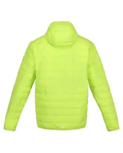 Férfi vékony steppelt kabát, Könnyû 20d poliamid anyag, Tartós víztaszító felület, Újrahasznosított, tollhatású, pehelytapintású töltet, Kb. 6db 500ml-es mûagyag palackból készült, újrahasznosított töltet, Könnyû töltet, Könnyen összenyomható, fix kapucni, 2 alsó zseb rejtett cipzárral, Rugalmas szélû szegélyek, elcsomagolható külön zsákba