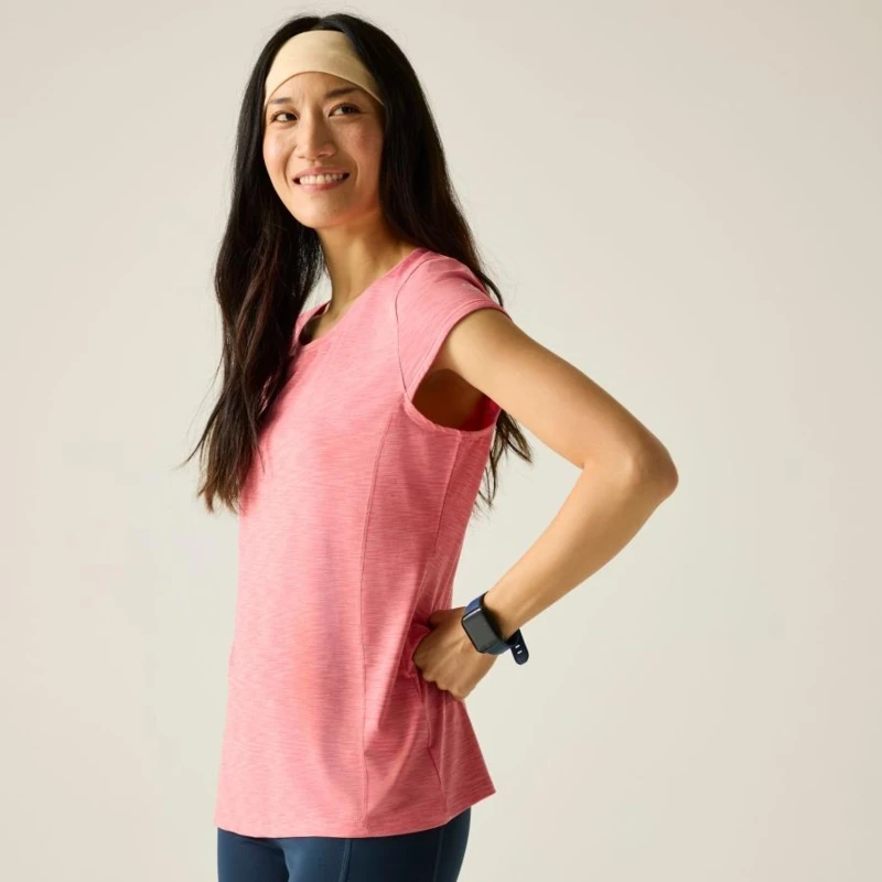 női gyorsan száradó póló, Gyorsan száradó, rugalmas 88% poliészter 12% elasztán anyag (színtől függő anyagösszetétel), Gyorsan száradó, rugalmas 90% poliészter 10% elasztán anyag (színtől függő anyagösszetétel), Jó nedvszívó teljesítmény