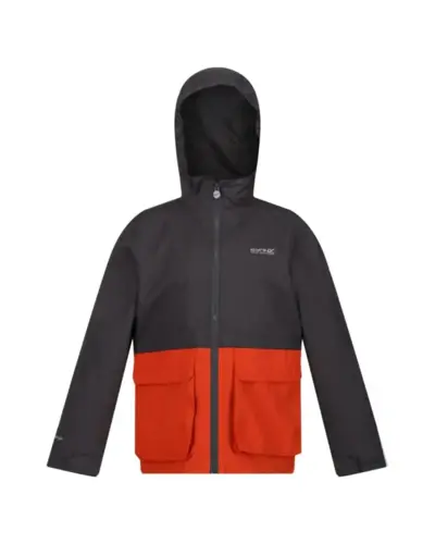Gyerek esőkabát, Vízálló Hydrafort 100% poliészter anyag, ragasztott varratok, a varrásnál leragasztva, hogy a tûpöttyöknél se ázzon át, Tartós vízlepergető felület, Részben hálós, részben poliészter taft bélés, fix kapucni, Dekoratív húzózsinór a kapucninál 7-8 év +, Állítható mandzsetta, 2 alsó zseb
