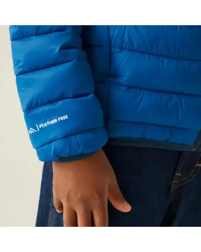 Gyerek könnyû steppelt kabát, Könnyû 20d poliamid anyag, Tartós vízlepergető felület, Feather Free – prémium minőségû újrahasznosított szintetikus pehelyszigetelés, Poliamid bélés, fix kapucni, 2 cipzáras alsó zseb, rugalmas szegélyek