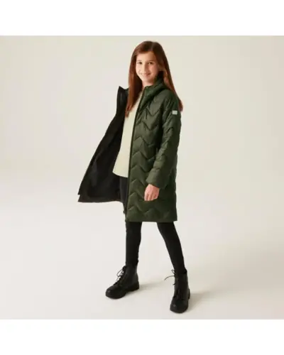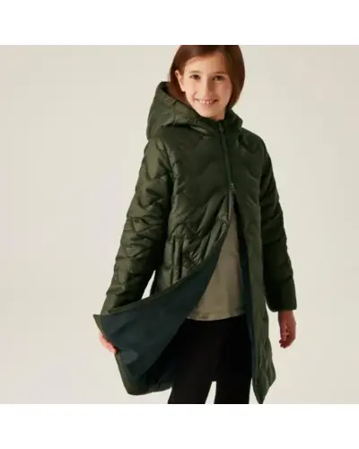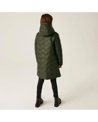 Gyerek vastag bélelt kabát, Anyag: Könnyû, 20d újrahasznosított poliamid szövet fémes felülettel, amely modern megjelenést biztosít., Vízlepergető: Tartós vízlepergető bevonattal ellátva, amely védelmet nyújt az eső és a nedvesség ellen., Szigetelés: Nehézsúlyú, újrahasznosított szintetikus Warmloft pehelytapintású szigetelés, amely hatékonyan tartja a meleget., Bélés: 100% poliészter taft bélés a kényelmes viselet érdekében., Cipzár: Kétirányú középső cipzár az elülső részen, amely lehetővé teszi a könnyû fel- és levételt, valamint a jobb szellőzést., Kapucni: Beépített kapucni a további védelem érdekében., Zsebek: Két alsó zseb, amelyek praktikus tárolási lehetőséget biztosítanak., Mandzsetták: Elasztikus mandzsetták a szorosabb illeszkedés és kényelem érdekében., Biztonság: 360 fokos fényvisszaverő csíkok a fokozott láthatóságért, különösen rossz látási viszonyok között., Nyomtatott névcímke: Nyomtatott névcímke elérhető 8 éves korig, a könnyebb azonosítás érdekében., Ez a kabát ideális választás hideg időjárási körülmények között, mivel könnyû, de meleg, vízlepergető és stílusos fémes felületével modern megjelenést kínál, miközben környezetbarát anyagokból készült.