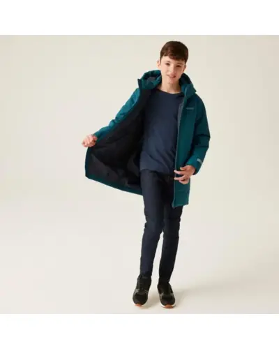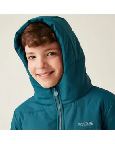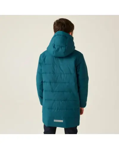 Gyerek vastag bélelt kabát, Anyag: Újrahasznosított 100% poliészter szövet., Vízlepergető: Tartós vízlepergető bevonat, amely segít megvédeni a kabátot a nedvességtől., Szigetelés: Nehézsúlyú, újrahasznosított szintetikus Warmloft pehelytapintású szigetelés, amely extra meleget biztosít hideg időjárás esetén., Bélés: 100% poliészter taft bélés, amely kényelmes viseletet biztosít., Belső zseb: Belső cipzáras biztonsági zseb, amely biztonságos tárolást tesz lehetővé., Kapucni: Beépített kapucni., Zsebek: Két alsó zseb a kényelmes tárolás érdekében., Mandzsetták: Elasztikus mandzsetták a szoros illeszkedés és kényelem érdekében., Biztonság: 360 fokos fényvisszaverő csíkok a jobb láthatóság érdekében, különösen rossz látási viszonyok között., Nyomtatott névcímke: Elérhető nyomtatott névcímkével 8 éves korig., Ez a kabát ideális választás hideg és nedves időjárás esetén, biztosítva a meleget, a vízlepergetést és a biztonságot, miközben környezetbarát anyagokból készült.