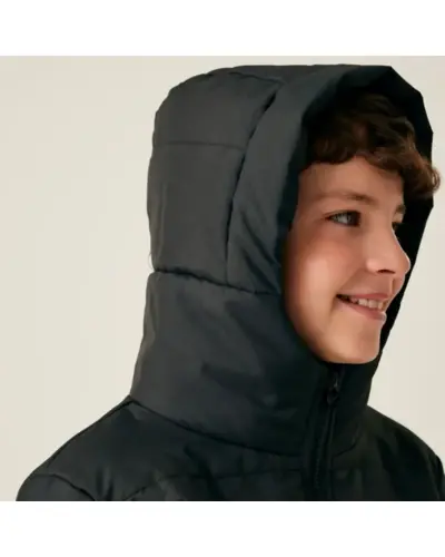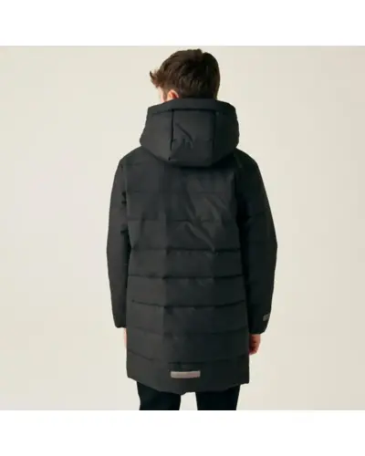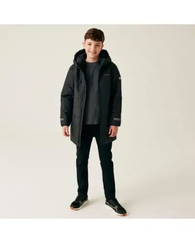 Gyerek vastag bélelt kabát, Anyag: Újrahasznosított 100% poliészter szövet., Vízlepergető: Tartós vízlepergető bevonat, amely segít megvédeni a kabátot a nedvességtől., Szigetelés: Nehézsúlyú, újrahasznosított szintetikus Warmloft pehelytapintású szigetelés, amely extra meleget biztosít hideg időjárás esetén., Bélés: 100% poliészter taft bélés, amely kényelmes viseletet biztosít., Belső zseb: Belső cipzáras biztonsági zseb, amely biztonságos tárolást tesz lehetővé., Kapucni: Beépített kapucni., Zsebek: Két alsó zseb a kényelmes tárolás érdekében., Mandzsetták: Elasztikus mandzsetták a szoros illeszkedés és kényelem érdekében., Biztonság: 360 fokos fényvisszaverő csíkok a jobb láthatóság érdekében, különösen rossz látási viszonyok között., Nyomtatott névcímke: Elérhető nyomtatott névcímkével 8 éves korig., Ez a kabát ideális választás hideg és nedves időjárás esetén, biztosítva a meleget, a vízlepergetést és a biztonságot, miközben környezetbarát anyagokból készült.