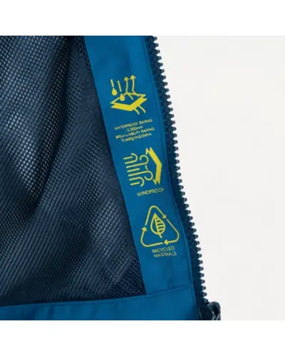 Gyerek esőkabát, Vízálló és légáteresztő technikai kabát újrahasznosított anyagból, ARED 15/15 újrahasznosított poliészter twill anyag vízálló, légáteresztő és rugalmas, Teljesen ragasztott varrások és vízlepergető bevonat az extra védelemért, PFC, PFOA, PFOS mentes környezetbarát kialakítás, Fényvisszaverő részletek a jobb láthatóságért, Magas galléros, beépített technikai kapucni elasztikus illeszkedéssel, 1 cipzáras mellzseb, 2 cipzáras alsó zseb és belső biztonsági zseb, Állítható tépőzáras mandzsetta és húzózsinóros szegély (7 éves kortól), Részben hálós, részben újrahasznosított poliészter taft bélés, Ideális túrázáshoz, aktív szabadtéri sportokhoz és mindennapi viseletre!