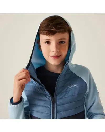 Gyerek hybrid felső, Poliamid panelek, Tartós vízlepergető felület, Extol Stretch panelbetétek – újrahasznosított 90% poliészter/10% elasztán, Újrahasznosított szintetikus Warmloft szigetelés, Könnyû töltet, Könnyen összenyomható, rugalmas szegélyek, Cipzáras védő a kényelmes viseletért, 2 cipzáras alsó zseb, Fényvisszaverő díszítés, Nyomtatott névcímke (8 éves korig)