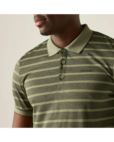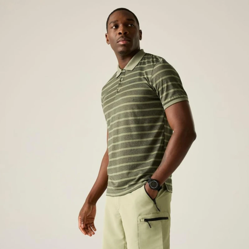 Férfi galléros póló, Anyag:, 150 g/m? 100% újrahasznosított poliészter csíkos dizájnnal, Tulajdonságok:, Újrahasznosított anyagokból készült – fenntartható választás, Kiváló nedvességelvezető képesség – segít szárazon tartani a bőrt, Bordázott gallér és mandzsetta kontrasztos szegéllyel – elegáns részletek, 3 gombos záródás – klasszikus és időtálló megjelenés, Tökéletes választás sportos és elegáns viselethez egyaránt.