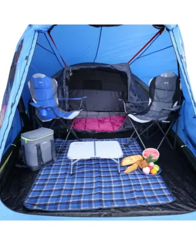 felfújhtó sátor 2 személyes, Sátor méret: 370 x 265 x 190cm (Csomag méret: 68 x 30 x 30cm), Könnyen és gyorsan felfújható biztos tartás, Tágas lakótér ablakokkal , Besötétíthető hálószoba a jobb alvásért, 3.000mm-ig vízálló Hydrafort 70D anyagú külső ponyva, Strapabíró, vízálló poliészter sátoralj, Könnyen felállítható, Több szellőzőnyílás, Jól használható belső zsebek és viharlámpa fellógatására alkalmas pont, Jól látszódó, élénk színû tartókötél szett, Bővíthető tárolózsák a könnyû be- és kicsomagolásért, Teljesen tûzálló anyagú