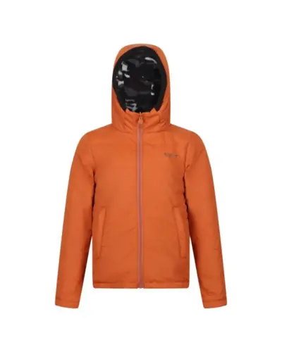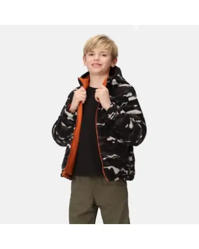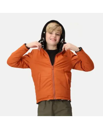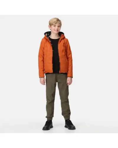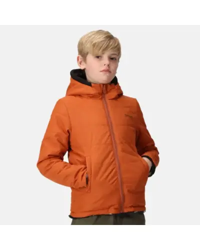Gyerek kifordítható kabát, 2 az 1-ben megfordítható kivitel – az egyik oldala steppelt az extra melegért, 100% poliészter anyag, Tartós vízlepergető felület, 200 g/m2 100% poliészter puha borg polár háttal , Thermoguard szigetelő töltet, fix kapucni, 2 cipzáras alsó zseb az egyik oldalon és 2 alsó zseb a hátoldalon, Fényvisszaverő díszítés