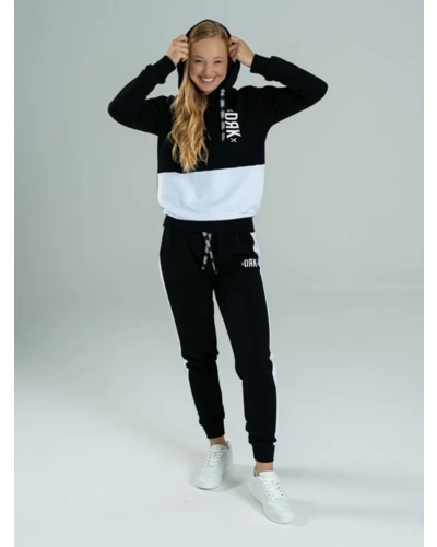 A Dorko Lisa jogging szett tökéletes választás, ha egyszerre vágysz kényelemre és egyedi megjelenésre. A 60% pamut és 40% poliészter anyagösszetétel gondoskodik a kellemes viseletről és tartósságról. A pulóveren DRK logós zsinór és bal oldali fektetett logó található, míg a passzés ujjakon 3D szövött logóval ellátott részlet teszi különlegessé. A hozzá illő csípőnadrágon a bal oldali DRK logó és az apró logós zsinór, valamint a fehér berakás és a passzés bokarész adnak dinamikus, mégis letisztult megjelenést. A modell 174 cm magas és S-es méretet visel.