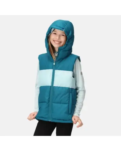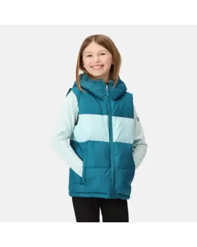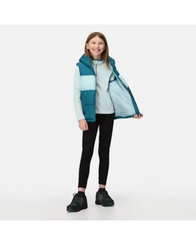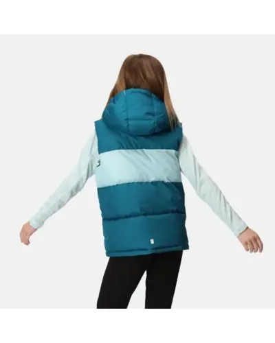 Junior steppelt mellény, 100% polyester, Tartós vízlepergető felület, Újrahasznosított, tollhatású, pehelytapintású töltet, Kb. 10db 500ml-es mûagyag palackból készült, újrahasznosított anyag és töltet, nehéz töltet, 2 cipzáras zseb