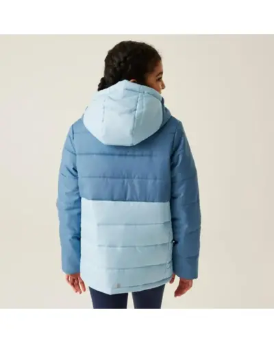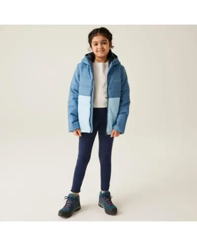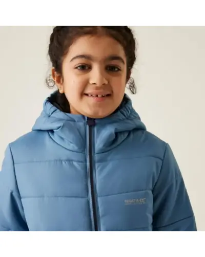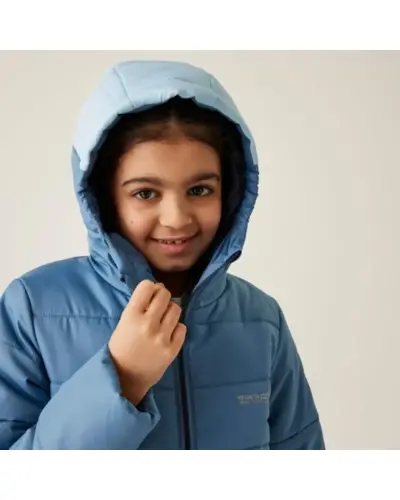 Gyerek bélelt kabát, Anyag: Újrahasznosított 100% poliészter szövet., Vízlepergetés: Tartós vízlepergető bevonattal, amely védi a kabátot a nedvességtől., Szigetelés: Nehéz súlyú Thermoguard szigetelés, amely hatékonyan tartja a meleget hideg időjárás esetén., Kapucni: Beépített kapucni elasztikus szegéllyel a jobb illeszkedés és védelem érdekében., Cipzárvédő: Cipzárvédő a kényelem növelése érdekében., Zsebek: Két cipzáras alsó zseb a biztonságos tárolás érdekében., Mandzsetták: Elasztikus mandzsetták a szorosabb illeszkedésért és a hideg szél kizárásáért., Biztonság: 360 fokos fényvisszaverő csíkok a fokozott láthatóság és biztonság érdekében, különösen gyenge fényviszonyok között., Nyomtatott névcímke: Elérhető nyomtatott névcímkével 8 éves korig, amely segíti a kabát azonosítását., Ez a kabát kiváló választás hideg és nedves időjárási körülmények között, mivel meleget, kényelmet és vízlepergető védelmet biztosít, miközben környezetbarát megoldásokat is kínál.