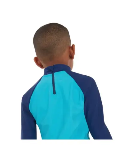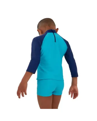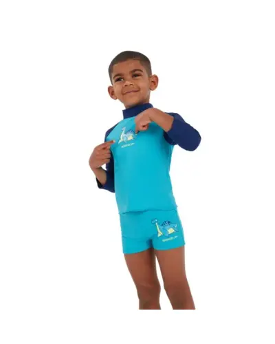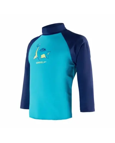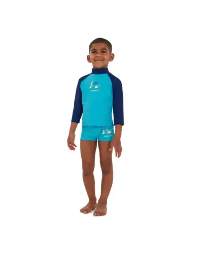 Keltsd életre az óceán varázsát a Learn to Swim termékcsaládunkkal. Szórakoztató és fényes, kéttónusú kék színben, ez a hosszú ujjú, nyomott felső tartalmazza játékos Percy, a plesiosaurus karakterünket. A felső UPF40+ szövetből készült fényvédőt tartalmaz, amely védi a kicsiket a vízben és a vízen kívül. Endurance10 anyagból készült, amely Creora HighClo-t tartalmaz, így hosszabb ideig újszerû marad.
