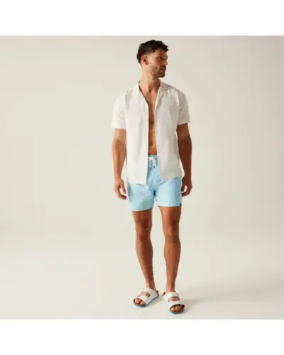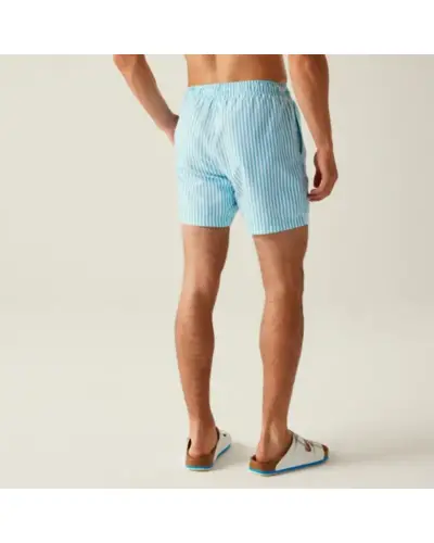 férfi fürdőnadrág, 100% újrahasznosított poliészter mikroszálas anyag, Csíkos, kreppelt hatású 100% újrahasznosított poliészter anyag, Gyorsan száradó anyag, Egyszínû vagy teljes felületén mintás kivitelben, Húzózsinórral állítható derékrész, Két oldal zseb, Egy farzseb, Rövid, hálós bélés, biztonsági zsebbel