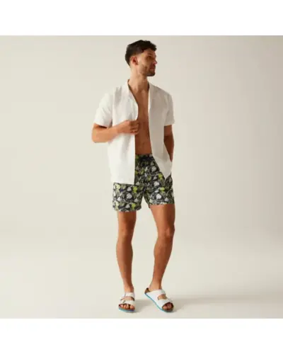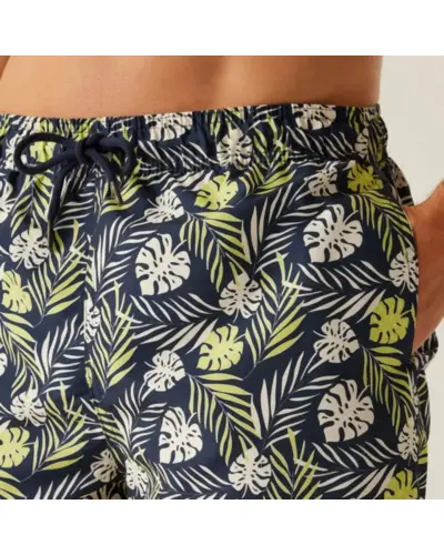 férfi fürdőnadrág, 100% újrahasznosított poliészter mikroszálas anyag, Csíkos, kreppelt hatású 100% újrahasznosított poliészter anyag, Gyorsan száradó anyag, Egyszínû vagy teljes felületén mintás kivitelben, Húzózsinórral állítható derékrész, Két oldal zseb, Egy farzseb, Rövid, hálós bélés, biztonsági zsebbel