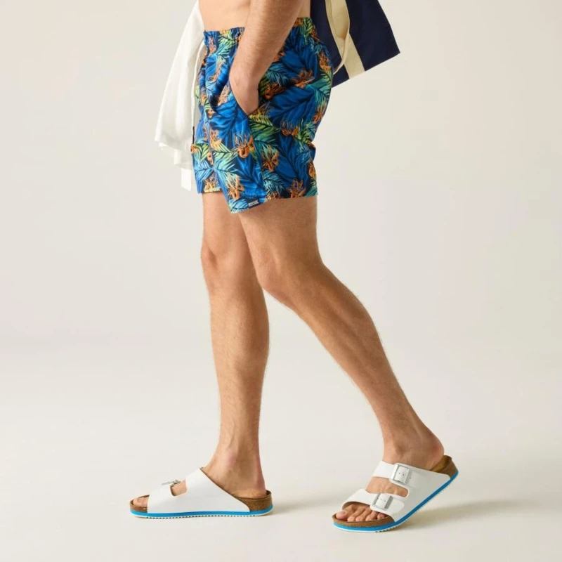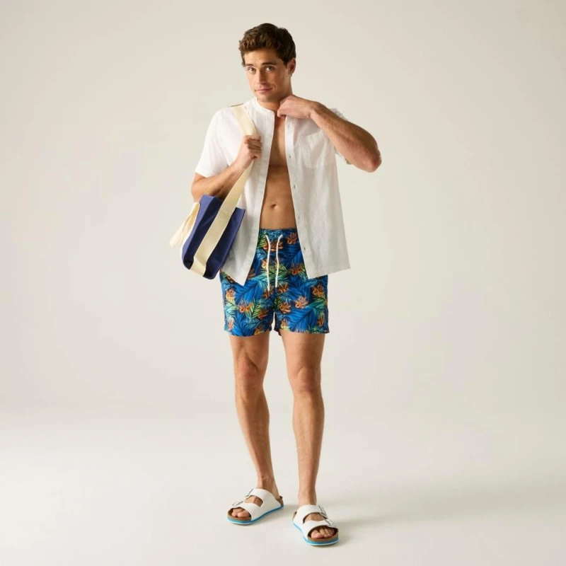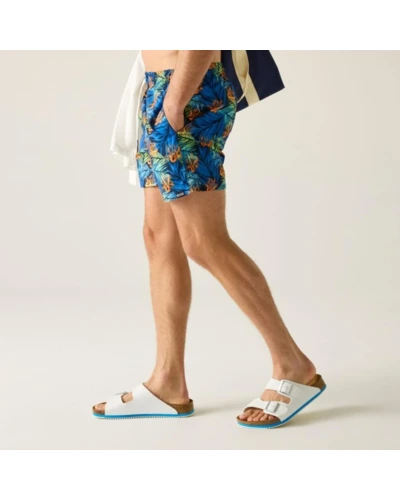 férfi fürdőnadrág, 100% újrahasznosított poliészter mikroszálas anyag, Csíkos, kreppelt hatású 100% újrahasznosított poliészter anyag, Gyorsan száradó anyag, Egyszínû vagy teljes felületén mintás kivitelben, Húzózsinórral állítható derékrész, Két oldal zseb, Egy farzseb, Rövid, hálós bélés, biztonsági zsebbel